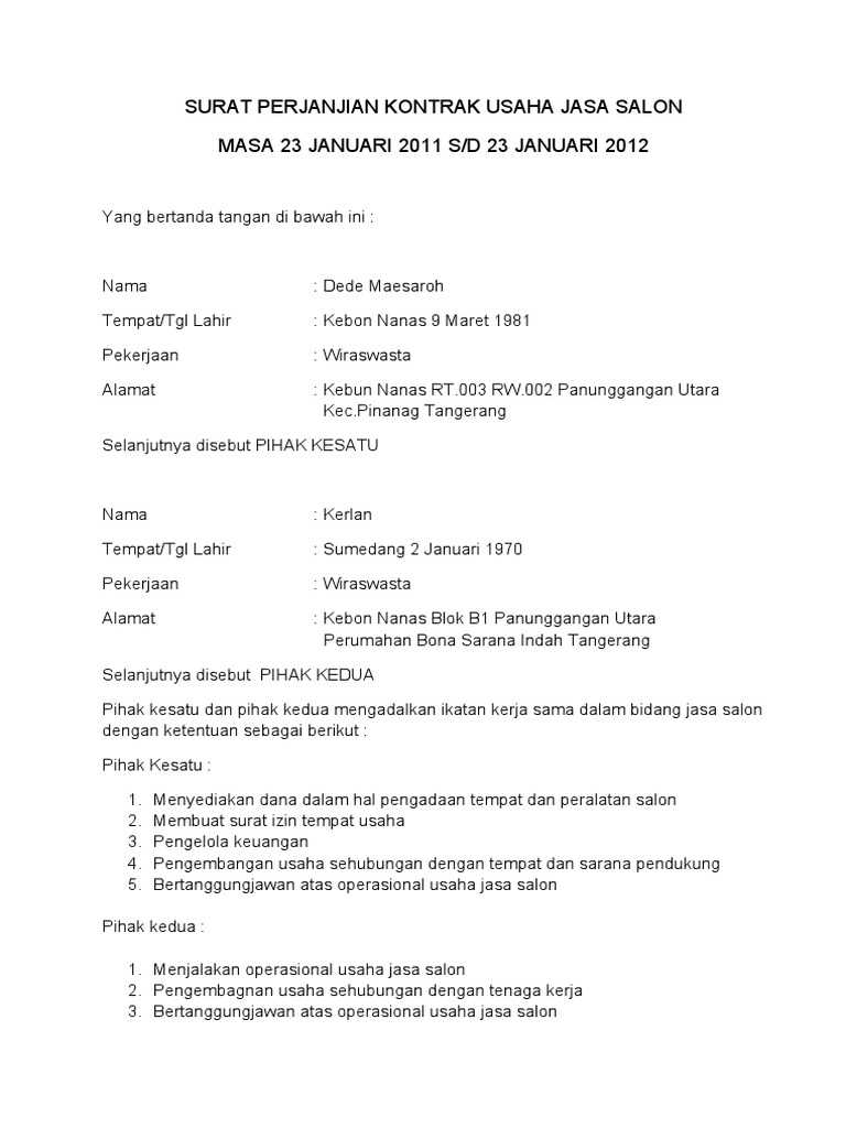 Doc Surat Perjanjian Kerjasama Usaha Riri Liezer Academia Edu from 0.academia-photos.com Mengurus kontrak perjanjian kerjasama bagi hasil usaha bersama kontrak hukum untuk memastikan kamu terlindungi dengan kontrak yang tepat. 3,712 likes · 5 talking about this. Ruang untuk berbagi informasi event dan juga kerjasama. Surat ini biasa dibuat oleh badan usah. Contoh surat perjanjian kerjasama usaha ini dibuat sebagai bahan panduan bagi siapa saja yang ingin mulai menjalankan usaha bersama. Contoh surat kontrak kerja freelance. Kerja sama merupakan kegiatan atau usaha yang dilakukan oleh beberapa orang atau lembaga, pemerintah untuk kerjasama kontrak adalah kerjasama atas dasar atau perjanjian tertentu. Dalam menawarkan investasi usaha, semakin lengkap dan jangan lupa juga siapkan draft kontrak kerjasama yang anda tawarkan, barangkali investor.